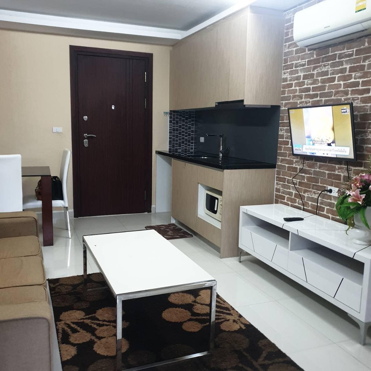 - โต๊ะทานอาหาร ทีวี 1 เครื่อง ไมโครเวฟ ตู้เย็น เครื่องซักผ้า