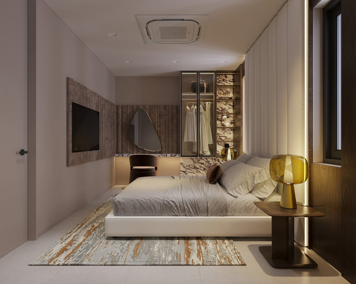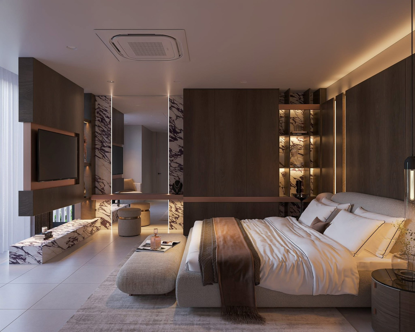 - ห้องนอนหลักสุดหรู พร้อมระเบียงส่วนตัวชมวิวสระน้ำ